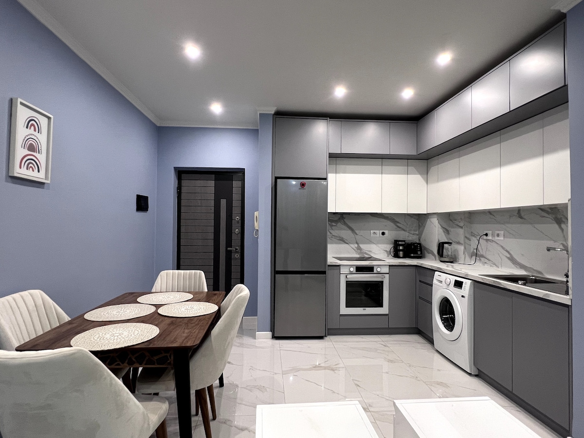 Beachfront Bliss with Jacuzzi & Bay Views 🌊✨ Step into luxury at our newly renovated 1-bedroom apartment, featuring a private jacuzzi on the balcony Ambient LED lighting with customizable colors and a full home sound system—all just steps from the sand in lively Durrës Bay. Whether you’re here to relax with a glass of wine in the jacuzzi, enjoy the lively atmosphere of the area, or simply wake up to the sound of the waves, this apartment has everything you need for an unforgettable stay.