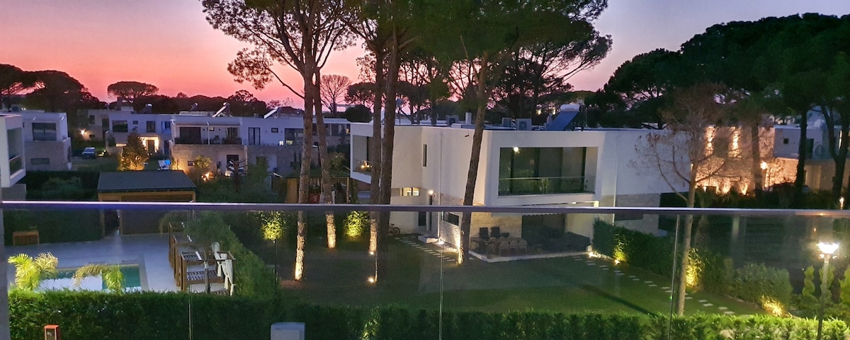 Amazing sunset views! Catch a falling star while sipping a drink on the balcony or have your morning coffee amidst the quiet, in the fresh air of pine trees. Discounts for weekly and monthly stays. Contact us for inquiries. Very safe, gated community. Well equipped for remote work with fast Wi-fi and AC in each room. Self-catering! Fully equipped kitchen. Free parking. 45 min from Mother Teresa Airport and Tirana, 230 m to the beach, nearby café/restaurant, kids playground + market.