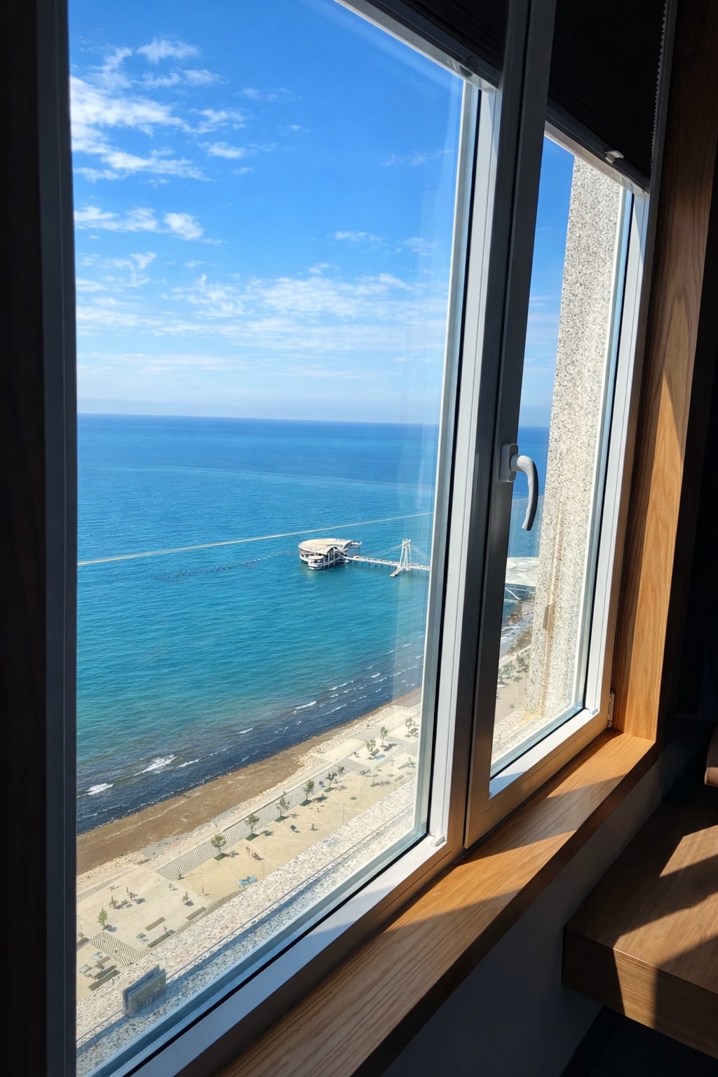 Centrally located in Plazh, Durres "Adriatic Panorama" offers the perfect balance of tranquility and accessibility. Whether you're seeking a romantic getaway or a family vacation, this stunning apartment offers unparalleled panoramic views of the Adriatic Sea, promising a serene and unforgettable stay. Relax in the spacious living room, complete with cozy seating and entertainment options including a flat-screen TV. Retreat to the peaceful bedroom and two full sea view balconies.