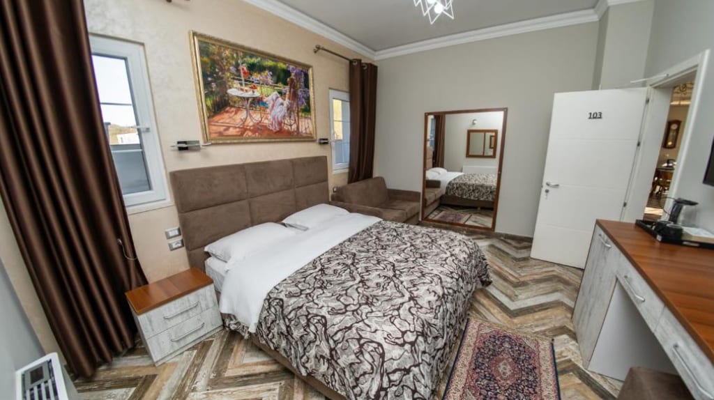 Introducing our luxurious hotel room 201, located 2 min away from the old bazaar of Kruja and the city center. Situated on the 3rd floor, this modern oasis boasts a jacuzzi and breathtaking city views. Enjoy the area with an open wardrobe and a Smart TV with Netflix for your entertainment needs. You'll find yourself just minutes away from the historic Kruja Castle and surrounded by a plethora of dining options, cafes, shops, ATMs, bakeries, currency exchange services, pharmacies, souvenir shops.