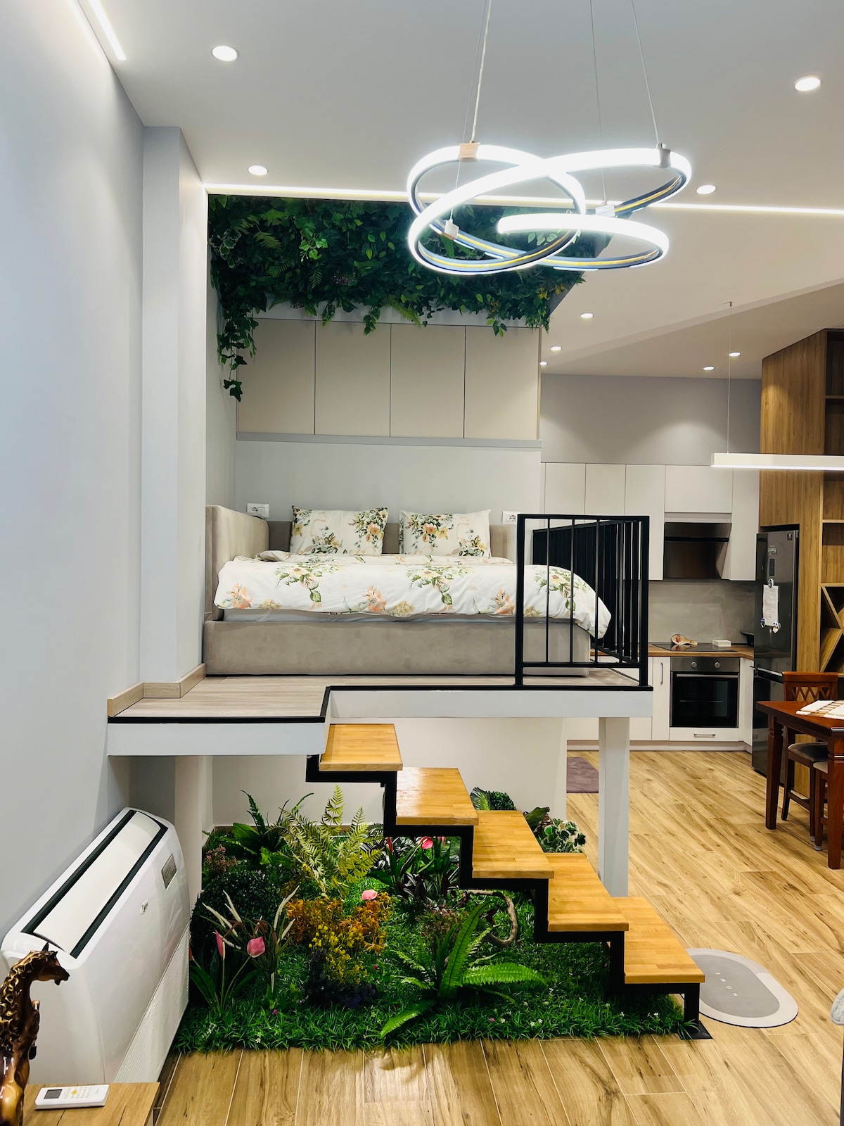 This bright studio in the city center sits on the top floors of a building overlooking the Grand Boulevard garden and Presidential Palace. The apartment includes: - Access Code - free WiFi - A/C - smart TV - private bathroom and shower - kitchen appliances - bed linen, and towels A minimarket is on-site. Steps from: - Skanderbeg Square - Tirana Lake - Stadium - Restaurants - Boutiques - Popular points of interest - Nightlife - Public transport and taxis