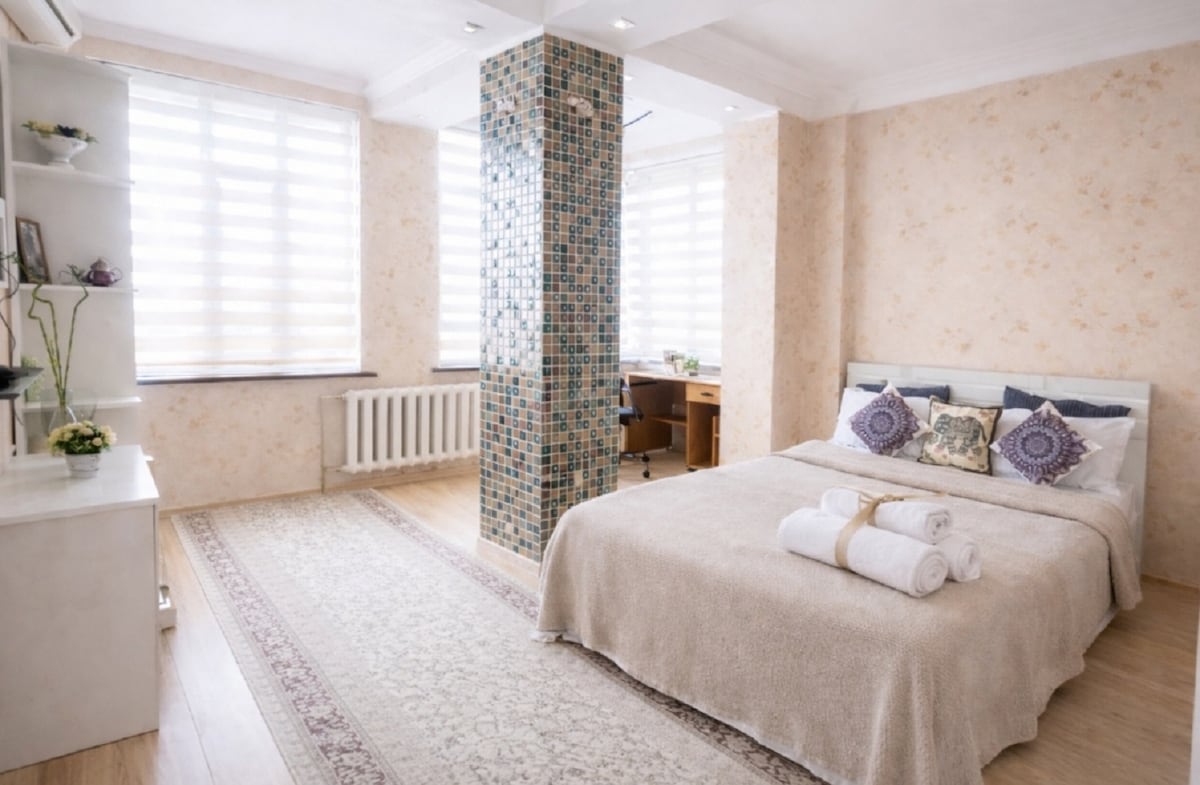 Enjoy your stay in the heart of Dushanbe, steps away from attractions and cafes. The apartment is decorated in a boho style with a touch of Tajik national colors and charm. For your convenience and well-being, we've installed a multi-stage water filtration system. Enjoy the freshness of Tajik water straight from the tap. We warmly invite you to stay in our home.