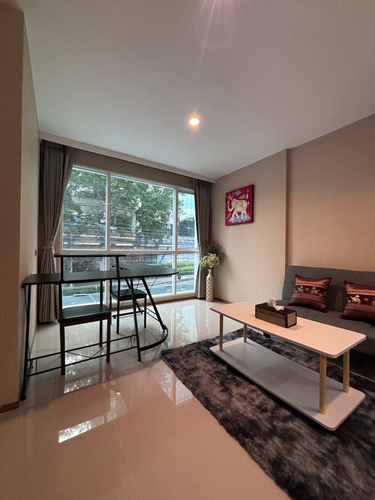 Experience modern comfort in our freshly renovated room, just a step from BTS Ari. Enjoy stunning city and sunset views from large windows, perfect for relaxing after a day of exploring Bangkok. Our space features midcentury-inspired decor, a cozy king sized bed and a peaceful ambiance. Conveniently located near trendy cafes, local markets, and public transport, it’s ideal for urban explorers looking for a chic retreat in the heart of the city.