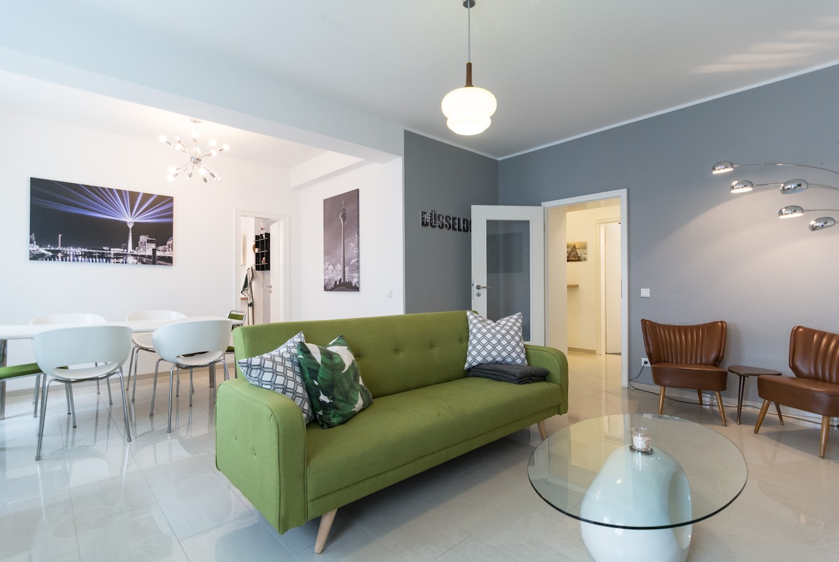 Stilvolles Apartment im lebhaften Flingern, ideal für bis zu 3 Personen. Mit Queensize-Bett (140x200 cm), Schlafcouch, Smart-TV (Netflix + Waipu Abo inkl.), Schreibtisch, Nespresso-Maschine und Kombi-Waschmaschine/Trockner ausgestattet. Zentrale Lage: 3 Min. zum Hbf mit U-Bahn, 4 Min. zum Schwimmbad, 7 Min. zur Altstadt, 7 Min. zum Discounter für Lebensmittel. Genieße die perfekte Mischung aus Ruhe und pulsierendem Stadtleben, ideal für kurze und längere Aufenthalte. !4. ETAGE - OHNE AUFZUG!