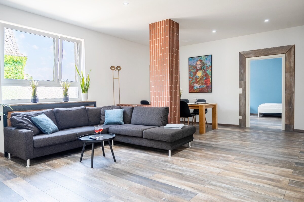 Die Unterkunft ist Teil einer wunderschönen, denkmalgeschützen Hofanlage aus dem Jahr 1820. Die Gästesuite befindet sich im ersten Obergeschoss unserer denkmalgeschützen, ehemaligen Scheune und verfügt über einen separaten Seiteneingang. Die Terrasse hinter der Scheune kann von unseren Gästen genutzt werden. Die Unterkunft liegt in unmittelbarer Rheinnähe. Der Medienhafen ist in 5-10 Minuten mit dem Fahrrad oder Auto erreichbar, die Innenstadt in 10-15 Minuten.