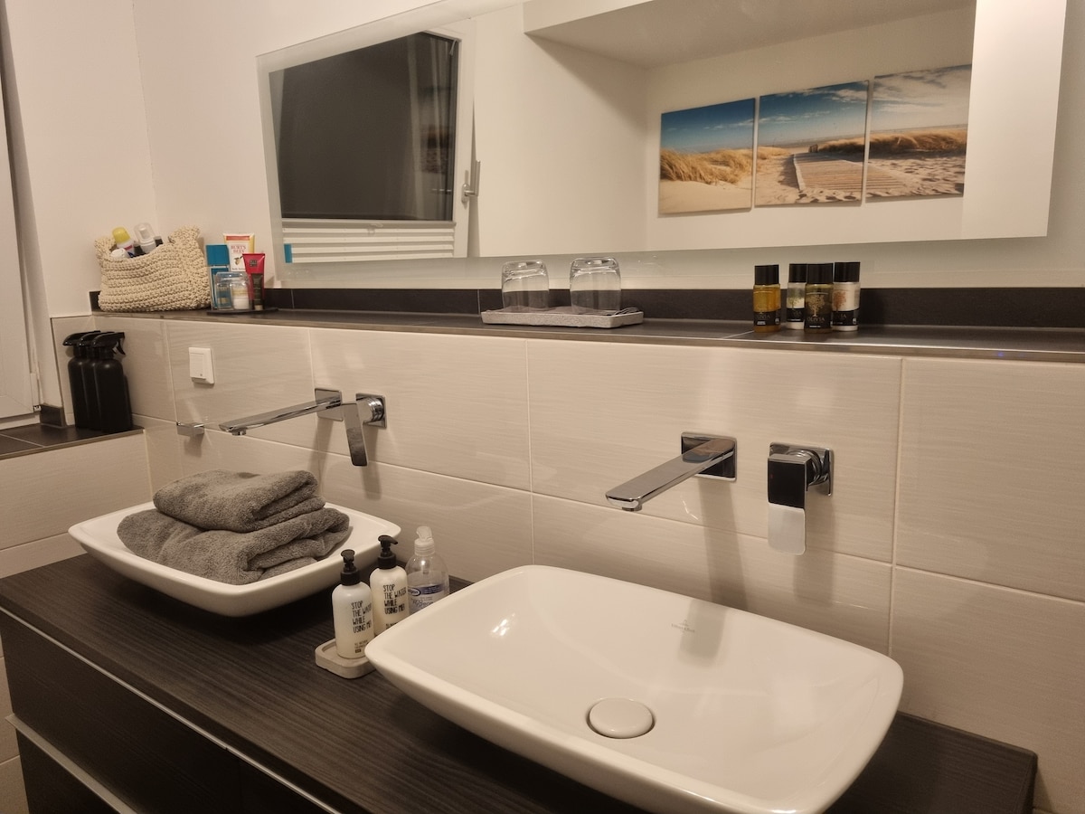 3 bedrooms with queen/kingsize bed Smart tvs in all bedrooms/living room Very well equipped kitchen bathroom with shower and bath-tub +2 guesttoilets floor heating big terrace parking place next to the house Distance to Fair Cologne about 35minutes by train oder car Fair Düsseldorf about 45minutes by train or car