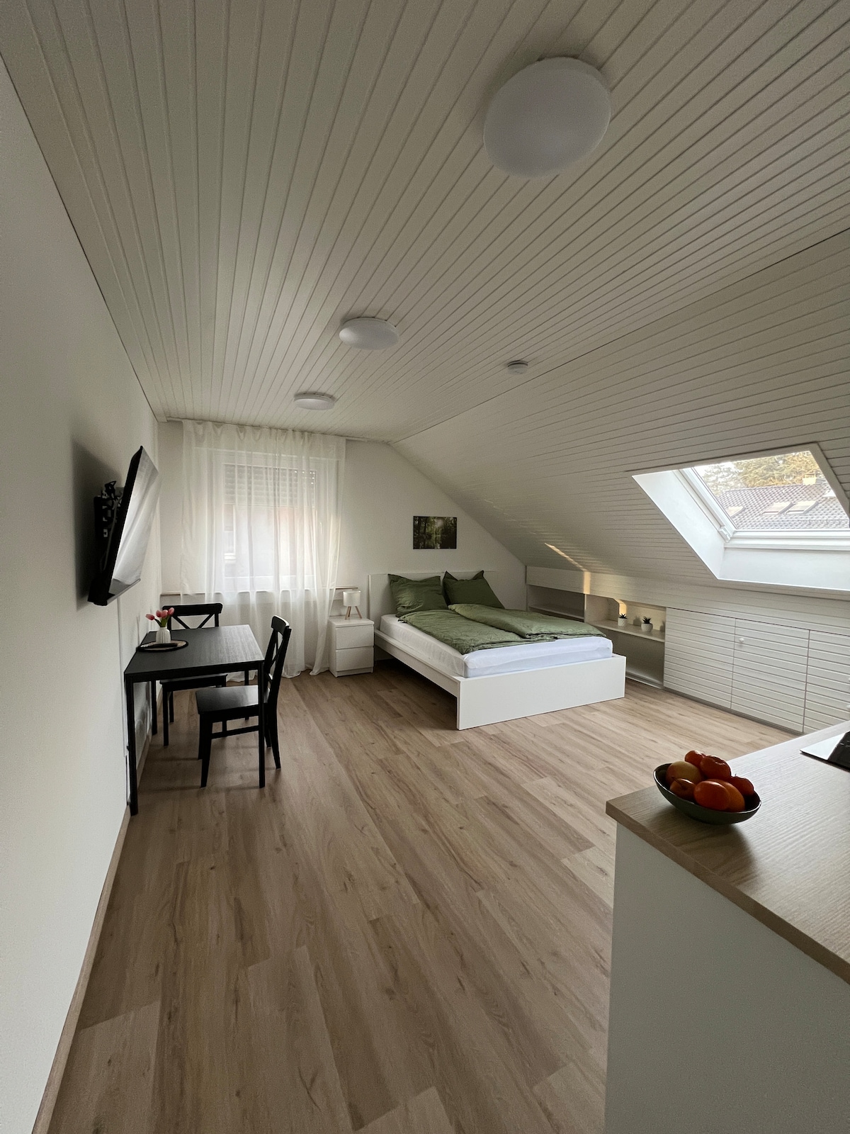 Wir vermieten unser kleines Gästezimmer (... es ist EIN Zimmer, auch wenn airbnb bei den Bildern Wohnzimmer und Schlafzimmer getrennt aufführt) mit eigenem Bad und Eingang. Das Zimmer hat ein Bett 80x200 cm, das sich schnell auf 160x200 cm verbreitern lässt. Das Zimmer hat zwar „nur“ ca. 13qm (plus Bad), aber sonst alles was man für einen kurzen Aufenthalt benötigt: einen Schrank, 2 Stühle, einen Tisch, Kühlschrank, die Möglichkeit Kaffee und Tee zu kochen... Tassen, Teller, Besteck ...