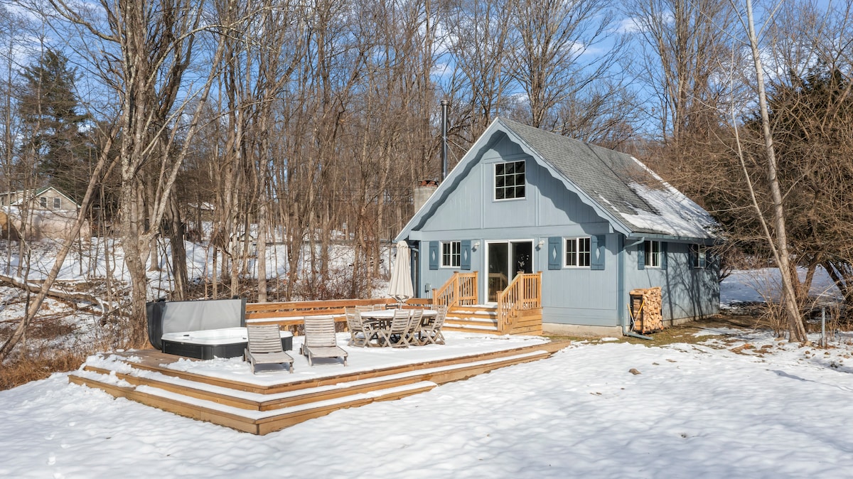 [ 🏊🏽♂️ Heated pool is open May - October 26, 2025. During the colder months we recommend soaking in our giant freestanding tub, which easily fits two humans.] Welcome to Maitopia - our modern, tiny cabin in the middle of a forest. We offer a fully stocked kitchen, a giant bathtub for two, a floating fireplace for cozy winter moments and a heated pool. Plus, a fenced in yard for your pup to roam! Please note: Because of bad experiences we don’t accept bookings from guests without reviews.