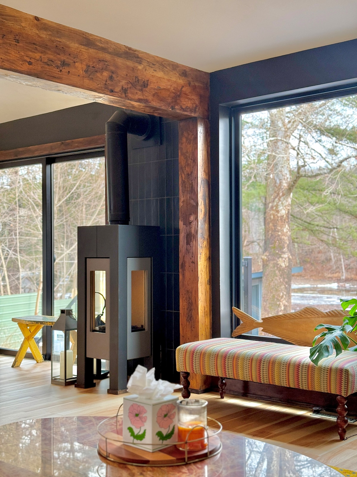 Far from the road, a tranquil modern cabin sits directly above a state-stocked fly-fishing and tubing river - an intimate, private escape under two hours from NYC. Set on a 120-acre property, with access to trails, river swimming, and a private cabin beach, you’ll feel completely secluded while still being 10–30 minutes from Red Hook, Rhinebeck, Hudson, and Kingston. Radiant floors, a Swedish composting toilet, Tesla Powered, w/ 500 Mbps fiber internet make it easy to unplug without sacrificing.