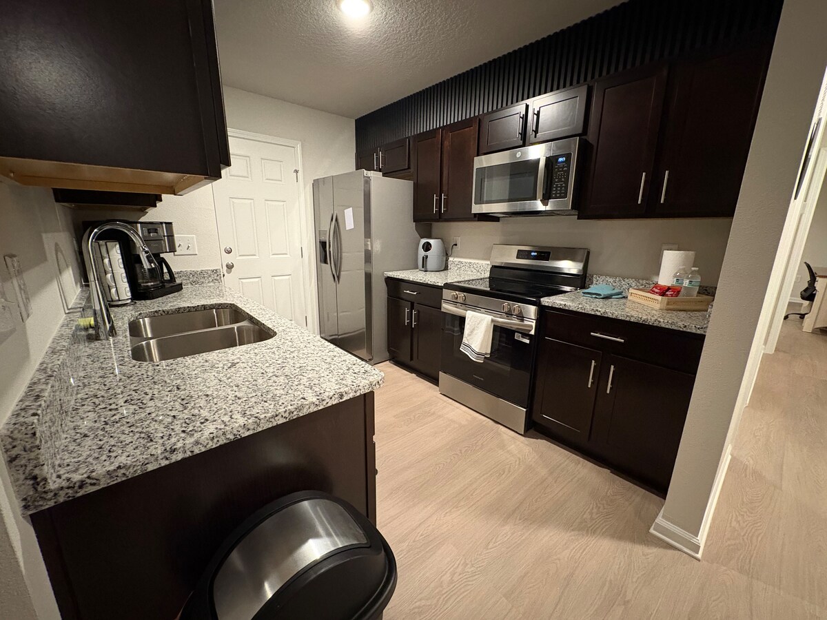 Have fun with the whole family at this stylish newly renovated home. Everything is modern & BRAND NEW! Enjoy a nice cozy evening in the backyard next to the fire. We have a king size bed in the master including a private FULL bathroom with a stand-up glass shower. The 2nd bedroom has a queen size bed next to the 2nd bedroom that has a garden tub. The living room couch pull outs & makes for queen bed. Each room has a smart tv with all your favorite shows.