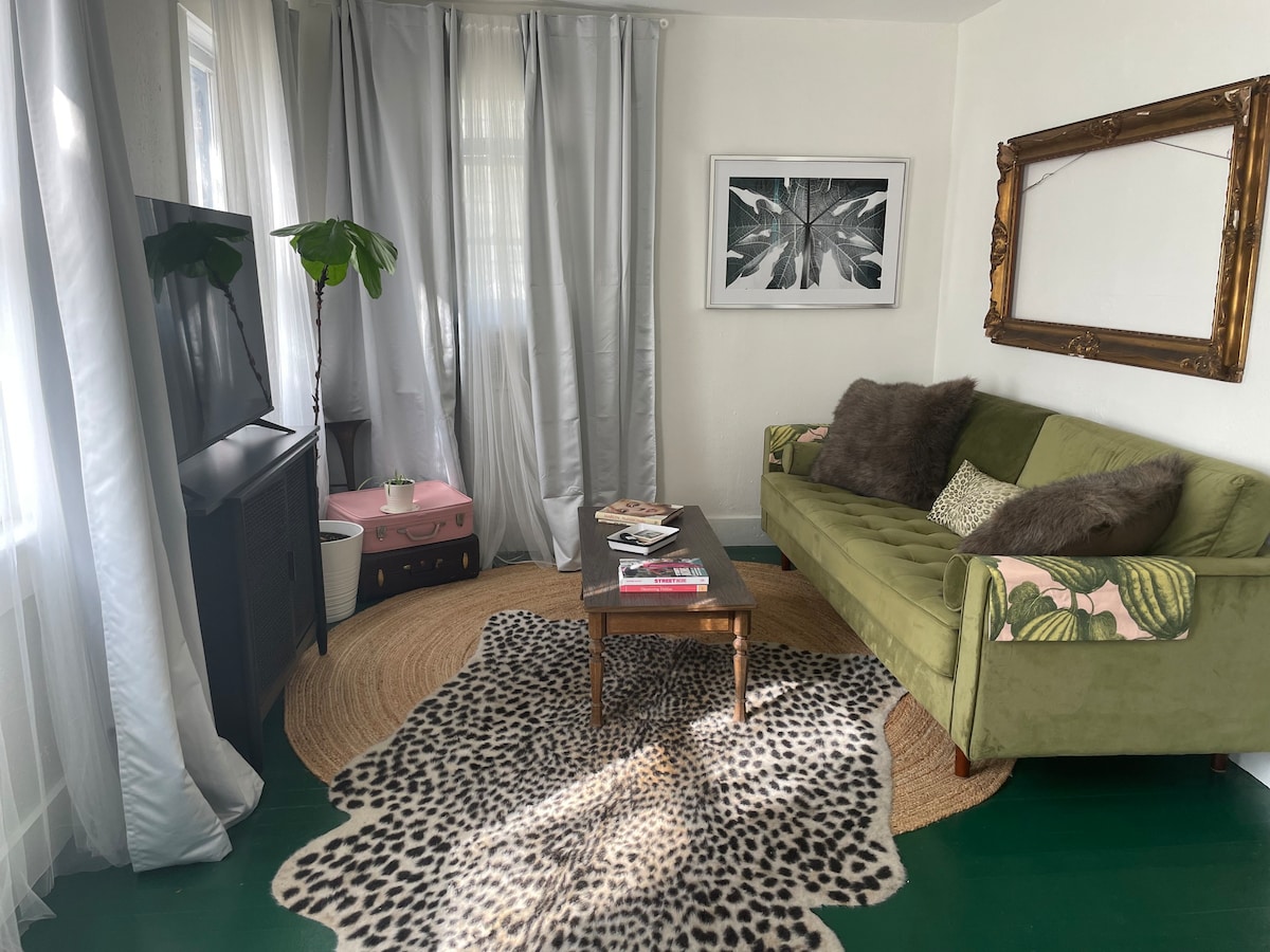 Enjoy a stylish art inspired experience at this centrally-located place. This 700 sq ft ( 65 sq m) apartment was inspired by the previous long term tenant who was from Serbia. This self-proclaimed gypsy was all about the Bohemian vibe with edgy colors, light wood and funky decor. Located in Riverside, this apartment is located walking distance to many well established restaurants and bars and the interstates. This is a self-contained one bedroom apartment that is 1/2 of a duplex. (side by side)