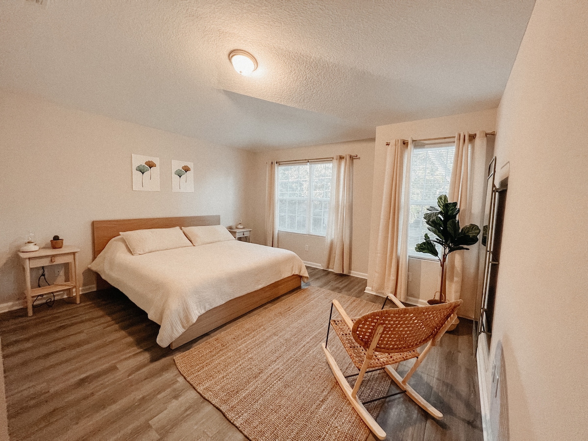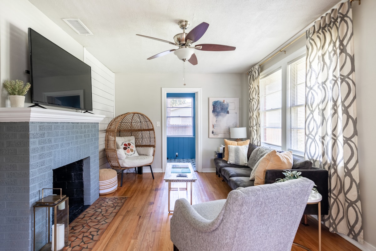 This charming bungalow is located in the heart of walkable Riverside; Jacksonville's most fun neighborhood. Enjoy a king bed, smart speakers, fast WiFi, and streaming channels, as well a fully stocked kitchen and a backyard with adirondack chairs, an electric grill, a fire pit, and even 'smores kits. Use our custom recommendation guide to explore local shops and restaurants on our cruiser bikes (complete with cup holders and cell phone holders). Private driveway parking is included, too.
