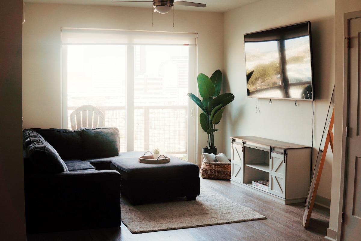 现代舒适的房源,靠近河畔城和机场