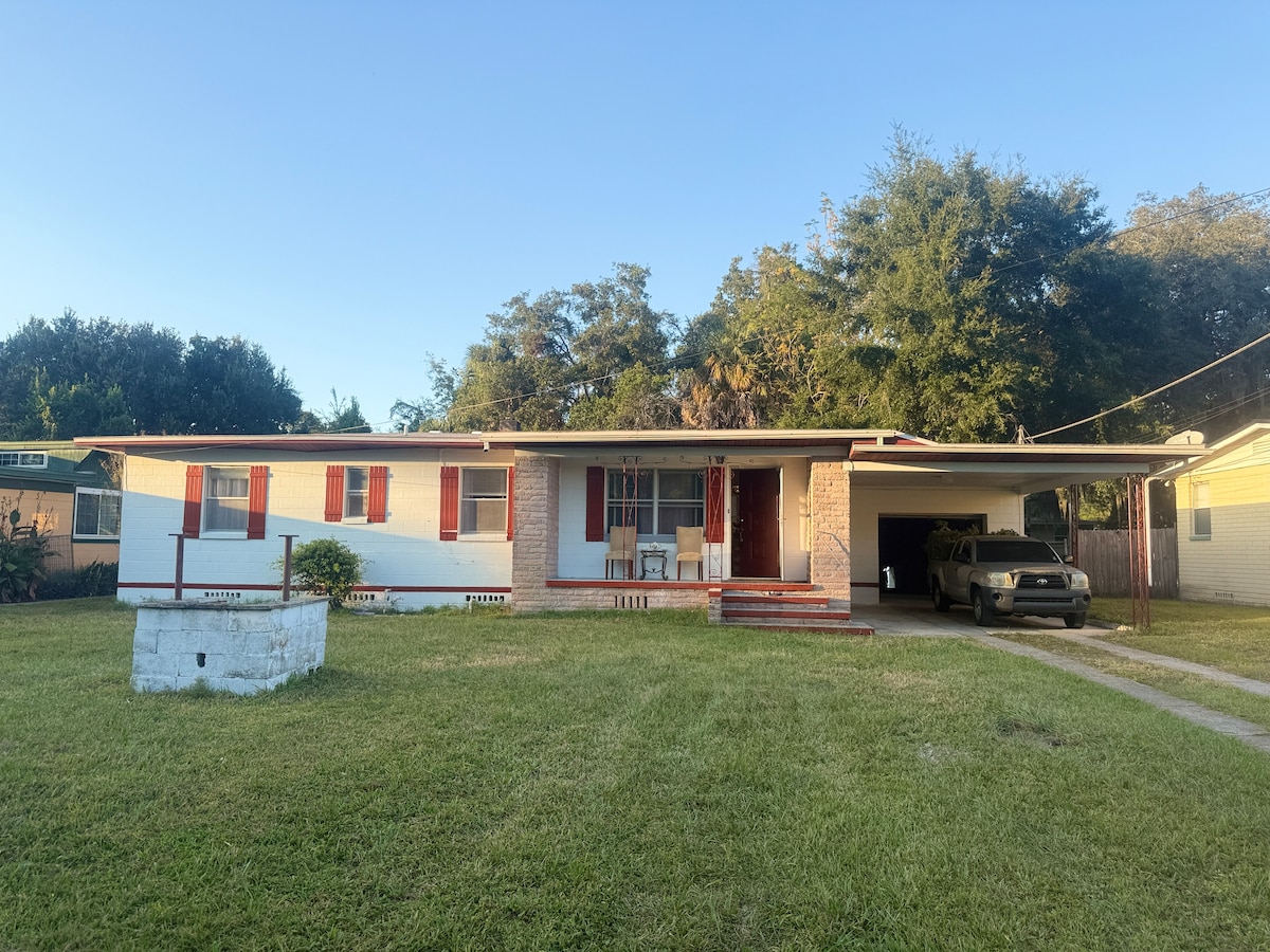 Enjoy your stay at this shady oak guesthouse. It is located on our 2 acres of land with the view of a neighboring lake. Don’t let the size fool you, it has a queen size bed, small kitchenette with fridge, microwave and coffee. The eating area can double as a workspace if needed. It has a full-size bathroom as well. It has a brand new ac and air purifier. It has outdoor seating, privacy fence and keyless entry. Minutes away from JIA, River City Marketplace, the Zoo and the Cruise terminal.