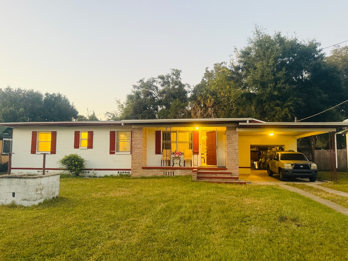 Enjoy your stay at this shady oak guesthouse. It is located on our 2 acres of land with the view of a neighboring lake. Don’t let the size fool you, it has a queen size bed, small kitchenette with fridge, microwave and coffee. The eating area can double as a workspace if needed. It has a full-size bathroom as well. It has a brand new ac and air purifier. It has outdoor seating, privacy fence and keyless entry. Minutes away from JIA, River City Marketplace, the Zoo and the Cruise terminal.