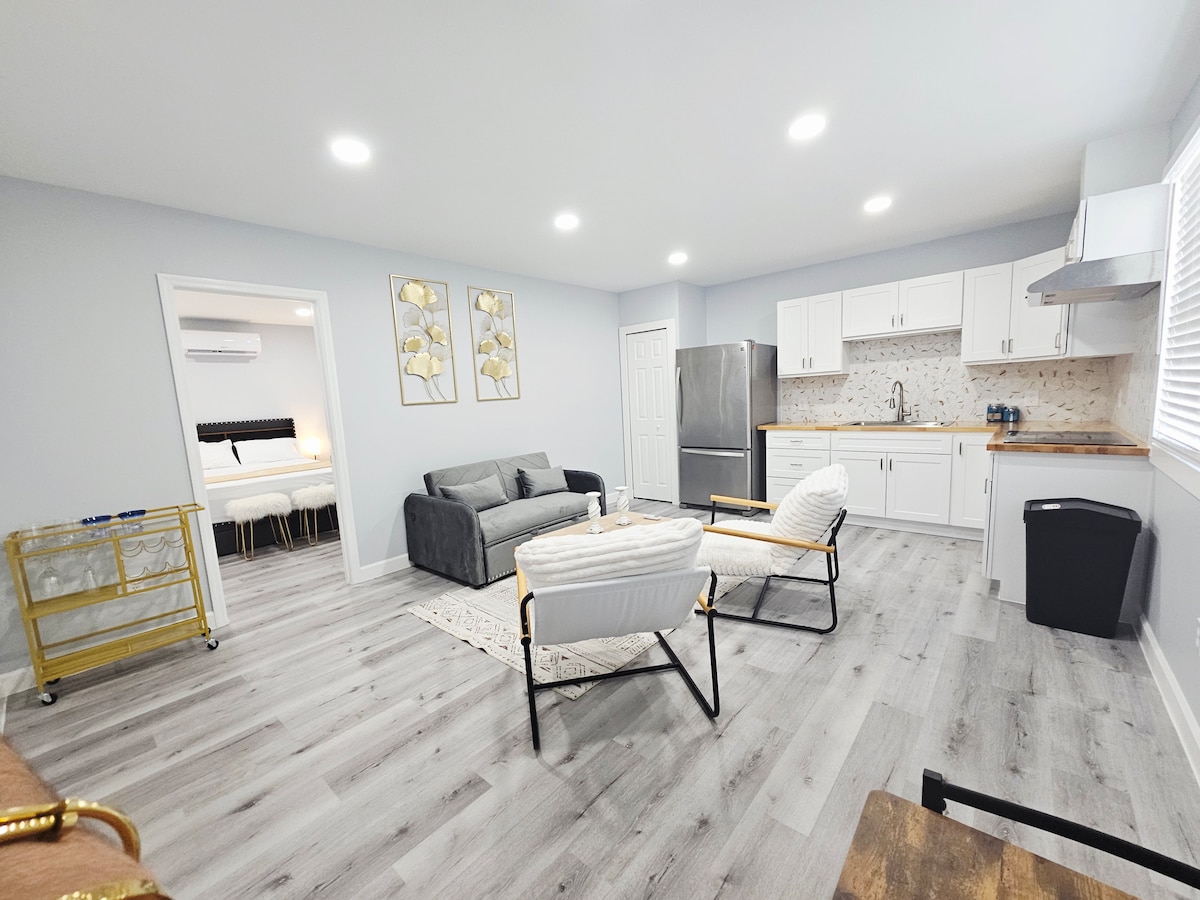 This cute space is attached to our home yet has complete privacy. there is one bedroom with one queen size bed The living area has a dual reclining sofa and chair so comfy to watch tv or sit by the fireplace on chilly nights. The main living space also has a table and chairs to enjoy meals or use as workspace. kitchenette with Keurig coffee maker , coffee , microwave, toaster oven, and mini-fridge. There is a cooktop in the apartment. Great location only 6 blocks from the beach.1