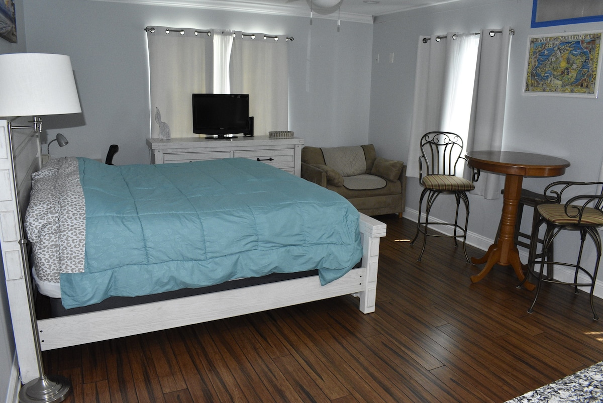 This cute space is attached to our home yet has complete privacy. there is one bedroom with one queen size bed The living area has a dual reclining sofa and chair so comfy to watch tv or sit by the fireplace on chilly nights. The main living space also has a table and chairs to enjoy meals or use as workspace. kitchenette with Keurig coffee maker , coffee , microwave, toaster oven, and mini-fridge. There is a cooktop in the apartment. Great location only 6 blocks from the beach.1