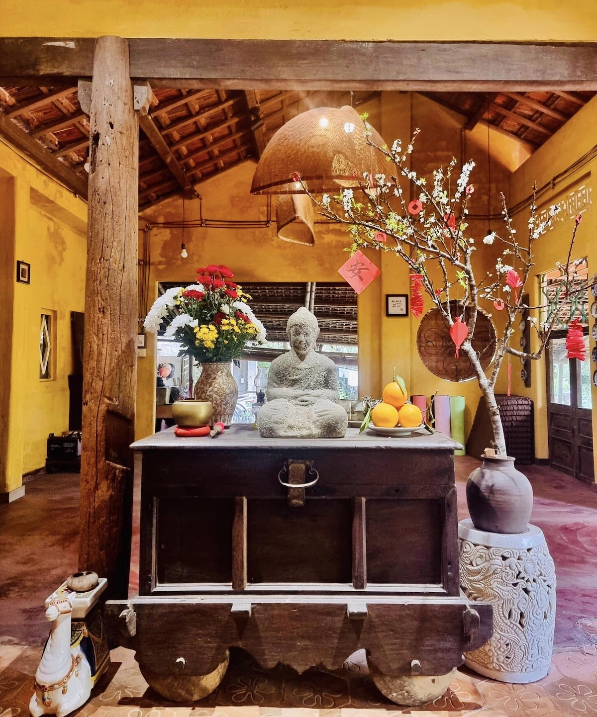 The architecture is mainly rustic red brick and sturdy dark wooden pillars, evoking the elegance of traditional Vietnamese houses. Inside, the design highlights simple yet sophisticated classic wooden furniture, including long beds and intricately carved tables, all set against exposed brick walls and terracotta tile floors. Outside, the villa opens onto a tranquil coconut garden, offering a peaceful retreat, away from the hustle and bustle of the city.