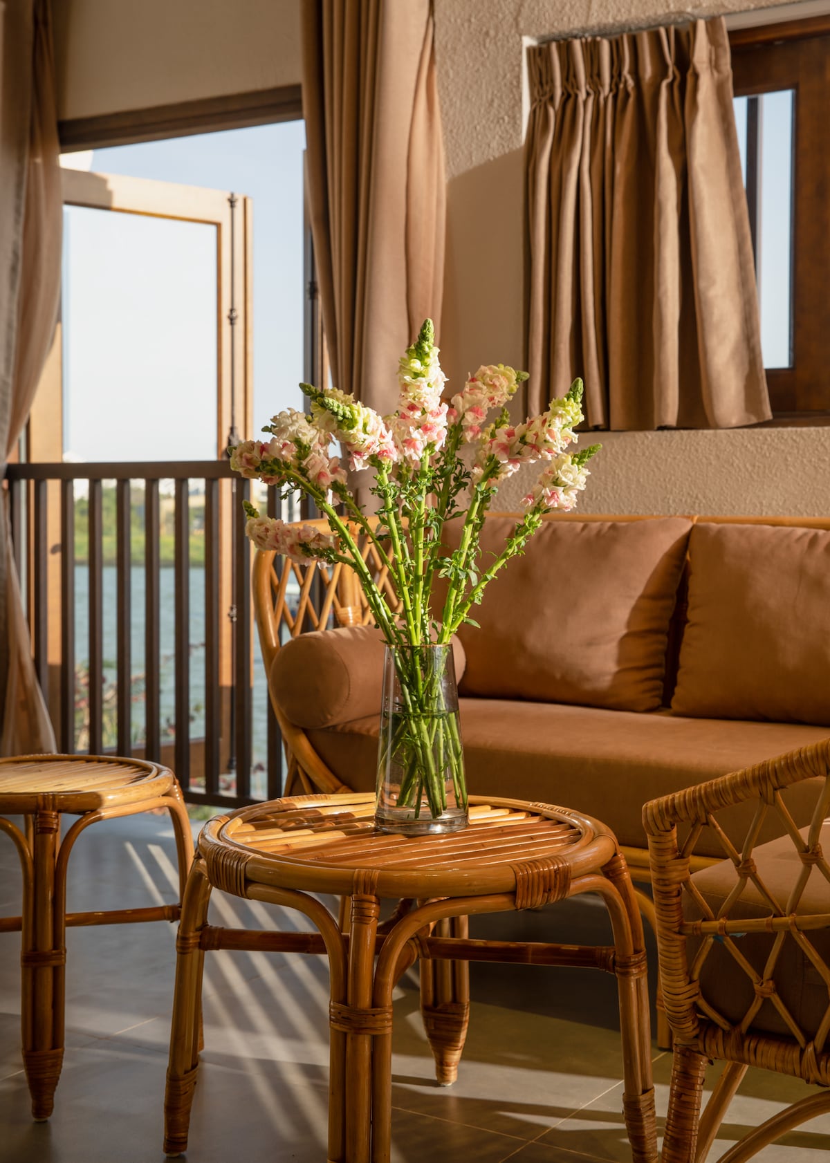 The architecture is mainly rustic red brick and sturdy dark wooden pillars, evoking the elegance of traditional Vietnamese houses. Inside, the design highlights simple yet sophisticated classic wooden furniture, including long beds and intricately carved tables, all set against exposed brick walls and terracotta tile floors. Outside, the villa opens onto a tranquil coconut garden, offering a peaceful retreat, away from the hustle and bustle of the city.