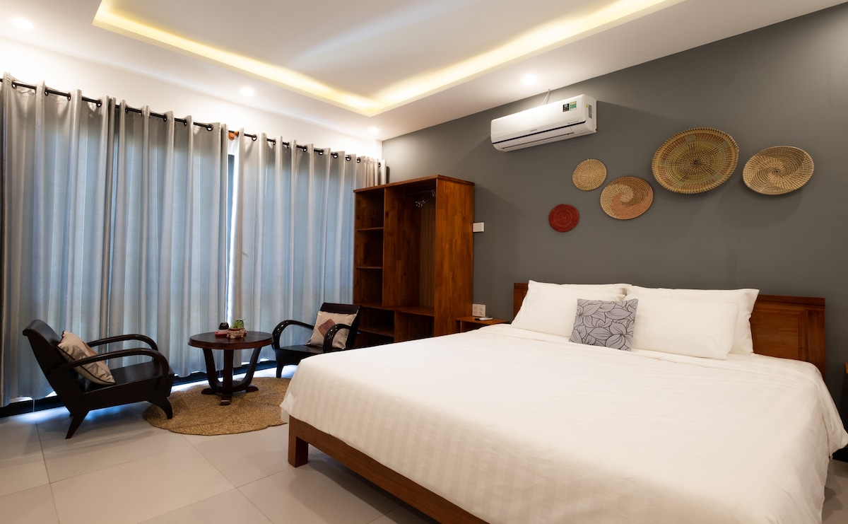 Our home is tucked away in a quiet alley off Phan Boi Chau Street, once known as Hoi An’s French Quarter. Just a short 4-minute walk from the Ancient Town and steps from the bustling market, the location offers both charm and easy walk to major attractions. Designed with an appreciation for traditional aesthetics, the house offers an experience of living in an art-filled gallery where the timeless Vietnamese cultural soul meets with modern comfort.