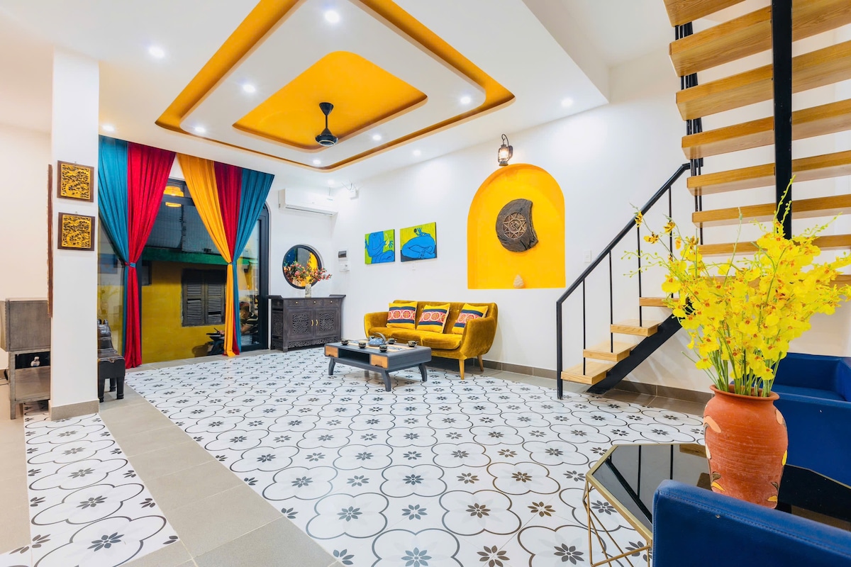 Nestled in a small alley on a street parallel to the riverside, our house is just steps away from the Hoai River. The house features a spacious kitchen and living room, and each bedroom has windows and balconies that are filled with sunlight and breezes from the two rivers on either side. Located right at the edge of the Old Town, just 300m from the Japanese Covered Bridge, surrounded by cafes, restaurants, and shops. Perfect for a family of 6 adults.