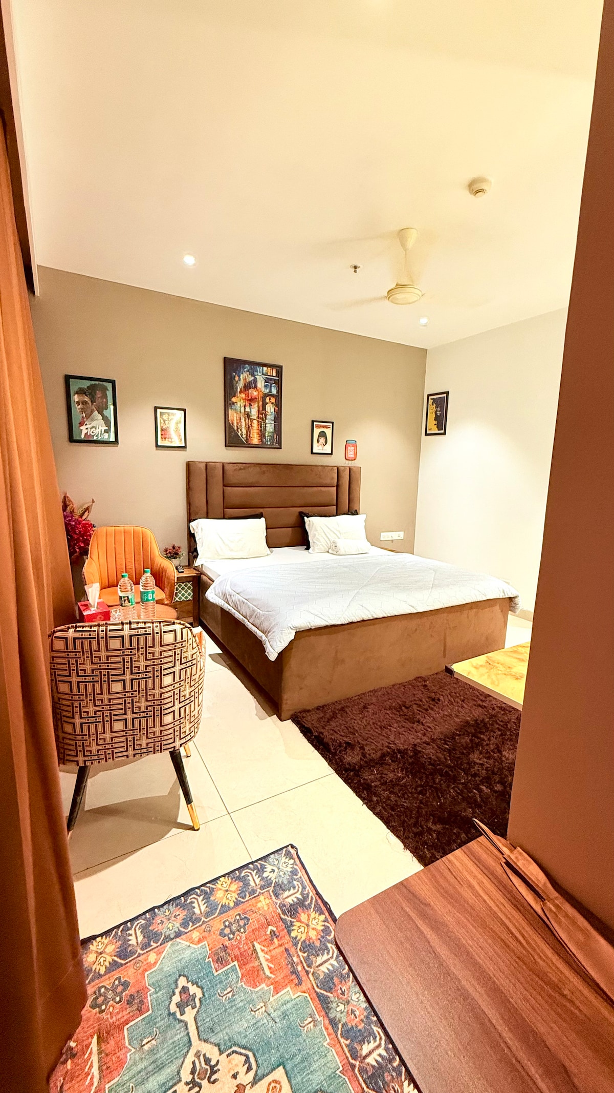 Welcome to our luxurious urban Studio, a sanctuary of style and sophistication in the vibrant heart of the Gurgaon. A standout feature of our loft is specialty Black color scheme, which adds a touch of elegance and drama to space, making your stay comfortable & stunning. As you step into our elegantly furnished Studio, you’ll be greeted by sight of our plush black recliners. These two luxurious recliners are the centerpiece, offering a perfect blend of contemporary design & exceptional comfort.