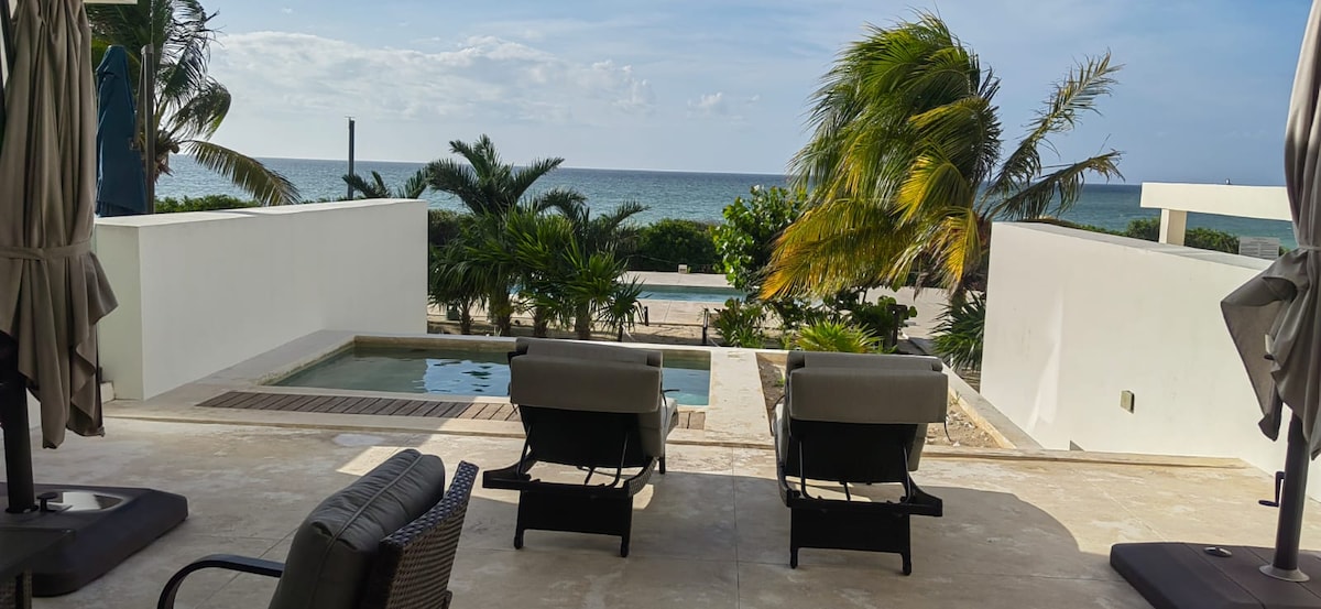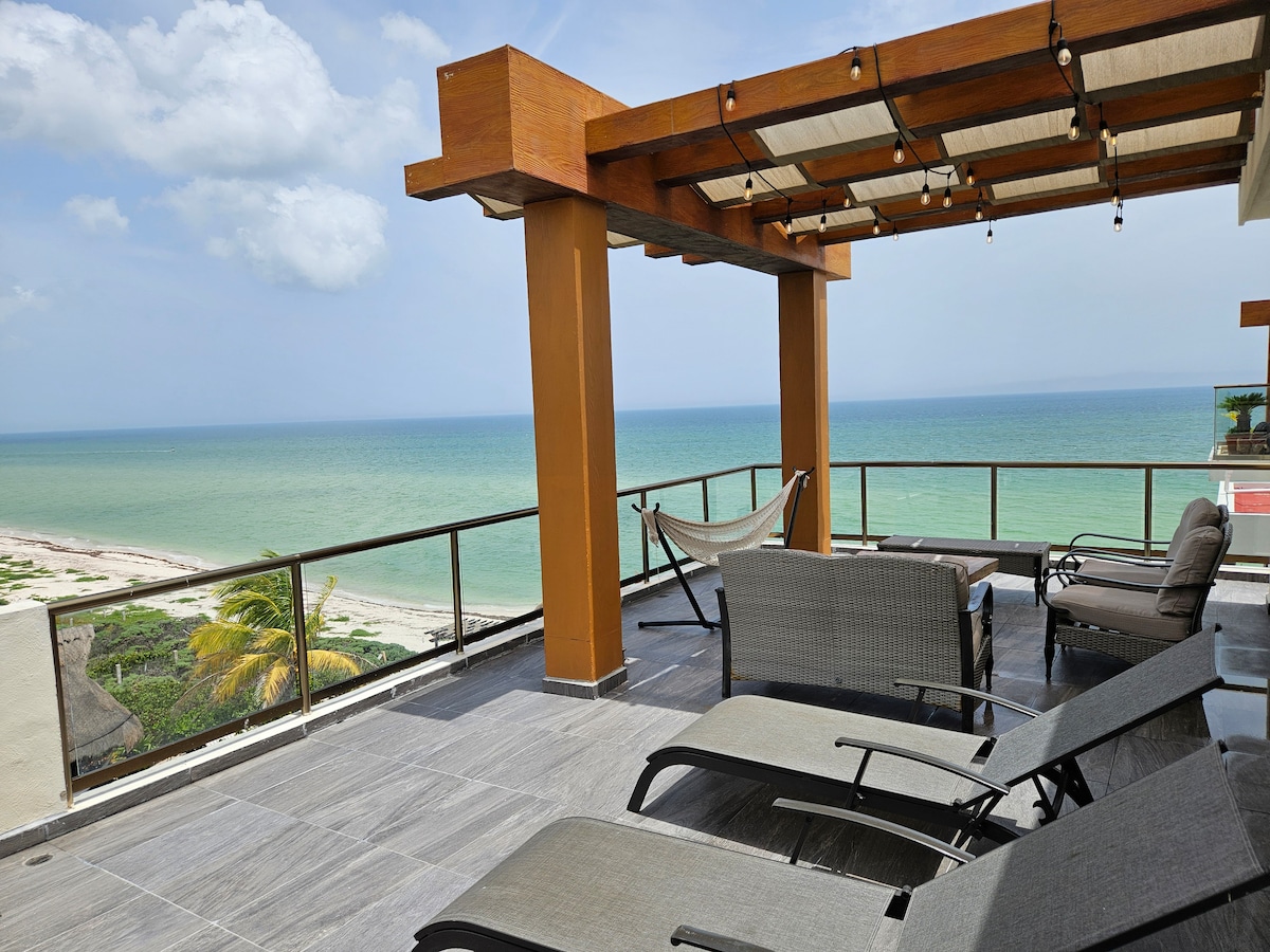 Bienvenido a este departamento frente a la playa con azotea y jacuzzi privado, en el complejo de condominios recientemente construido con todas las instalaciones que uno pueda imaginar. Esta propiedad tiene vistas al mar desde todas las ventanas y todos los lados de la terraza. El nuevo condominio se encuentra en la playa de San Benito, km 24.5 al este de Progreso. A 15 minutos en coche de Progreso. Al ser un lugar remoto, ofrece todos los servicios.
