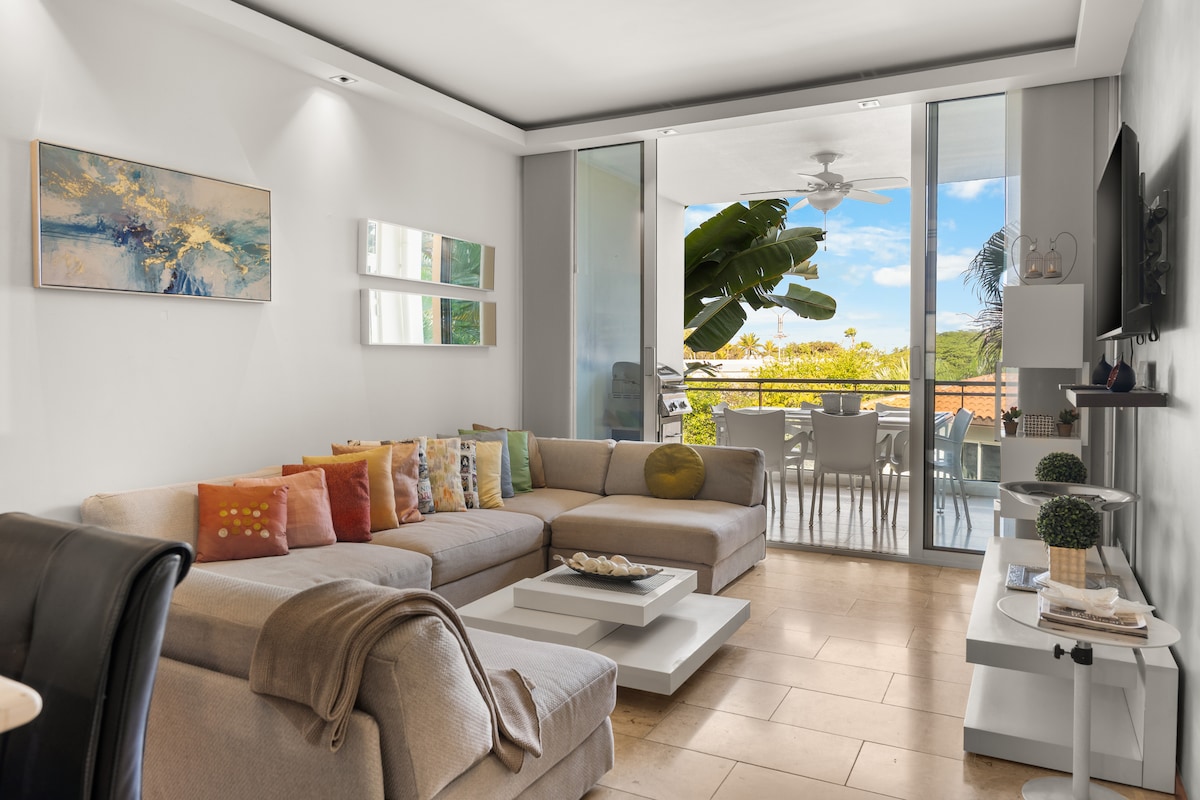This cozy and elegant one bedroom apartment is part of "Oasis" the most luxurious condominium on the island , located a few steps from "Eagle Beach" many times selected winner of the World Travel Award. Fully furnished, large and comfortable living area of 1000 sf plus 750 sf of terrace,2 full bathrooms, Smart Tv’s,cable,free Wi-Fi,fully equipped kitchen, a/c,washer/dryer, water heater, safe, private parking, walking distance to restaurants and supermarkets