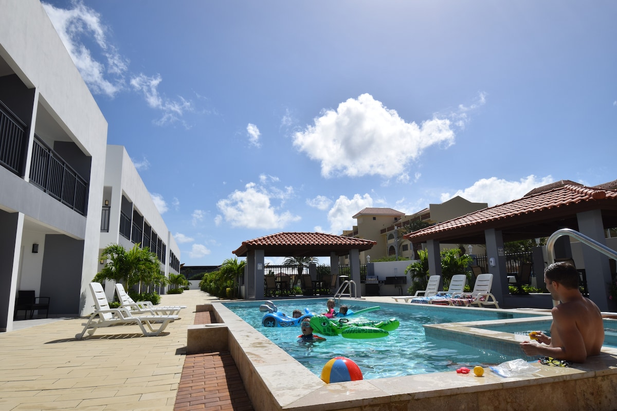 Spacious two bedrooms, two bathrooms apartment with a queen sofa bed in the living room. Located just 4 minutes walking distance to the amazing Eagle Beach. Free High speed internet. Full equipped kitchen, inside washer and dryer. Balcony with pool views. Free Parking space for guest. We provided Beach towels, chairs and a small cooler. The Condo has swimming pool, jacuzzi, Barbecue Grills, small Gym, 24/7 security. Located close to restaurants and supermarkets. Great for family vacations.