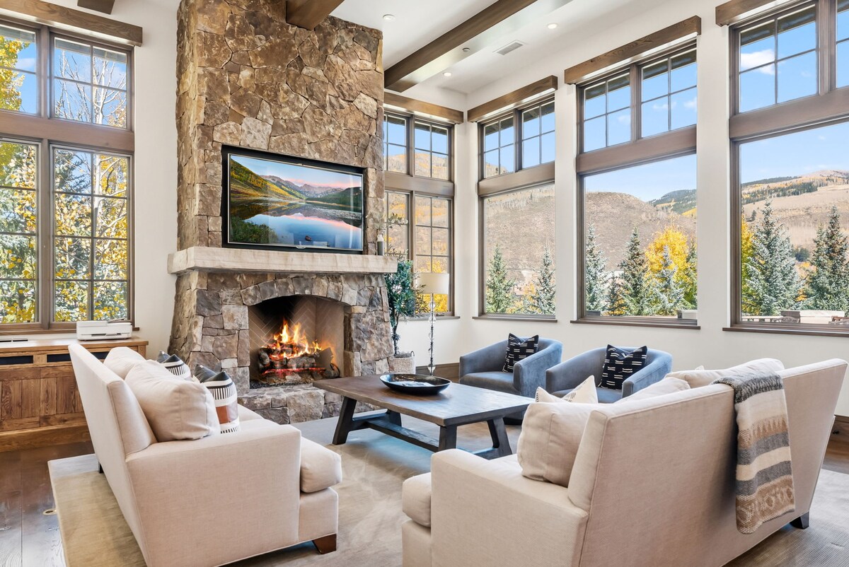 Welcome to Vail Aspen Haven, hosted by InvitedHome. This architectural retreat blends contemporary elegance with the tranquility of its alpine surroundings. Thoughtfully designed for luxury and comfort, the home offers soaring ceilings, floor-to-ceiling windows, and seamless indoor-outdoor living. The open-concept great room is centered around a striking stone fireplace, with plush seating arranged to take in the views of the surrounding aspens.