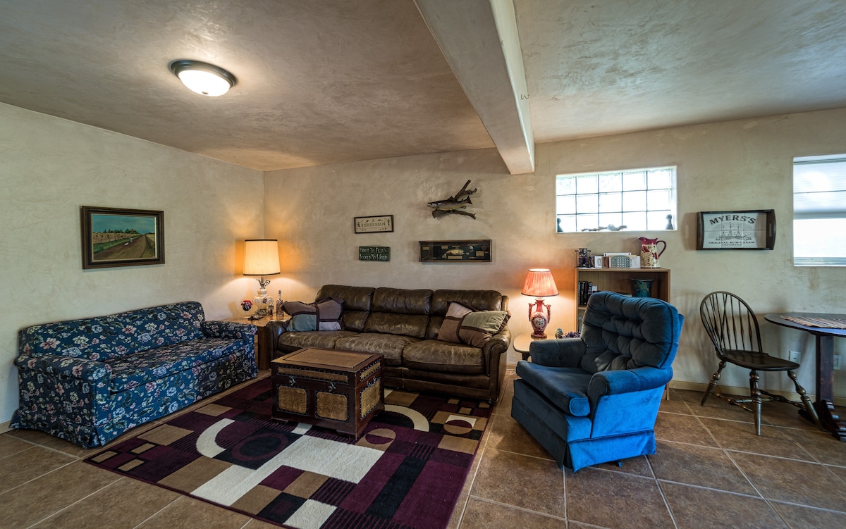 Large and Cozy basement lockoff Fully Equipped large kitchen new carpeting king bed and queen bed newer sofa/ bar table/ games/ Chair that converts to child bed W/D- Kithen table seats 4 dishwasher/ all kitchen supplies Coffee maker and I try to provide coffee pods/lots of towels many extra blankets Fireplace heater/mood light smart TV/ cd player / fun videos Wi block Multiple fans but cool in basement heater security cameras in entry Kingbed Queen Bed Floor futon Roku desk area