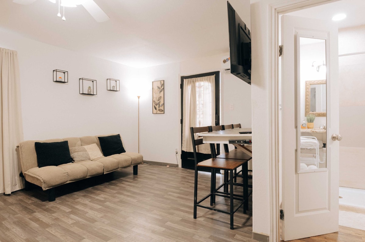 Keep it simple at this peaceful and centrally-located place. This is a 100 + year old remodeled backyard studio apartment with access to a shared pool, and backyard patio area. Studio apartment includes: queen size bed, pullout sofa sleeper, kitchen, full bathroom, flat-screen Fire TV, DIRECTV, and WiFi. No smoking of any kind including vaping allowed. Weekly maid service provided once a week for stays more than 7 days. No children. No more than 4 occupants. No pets.