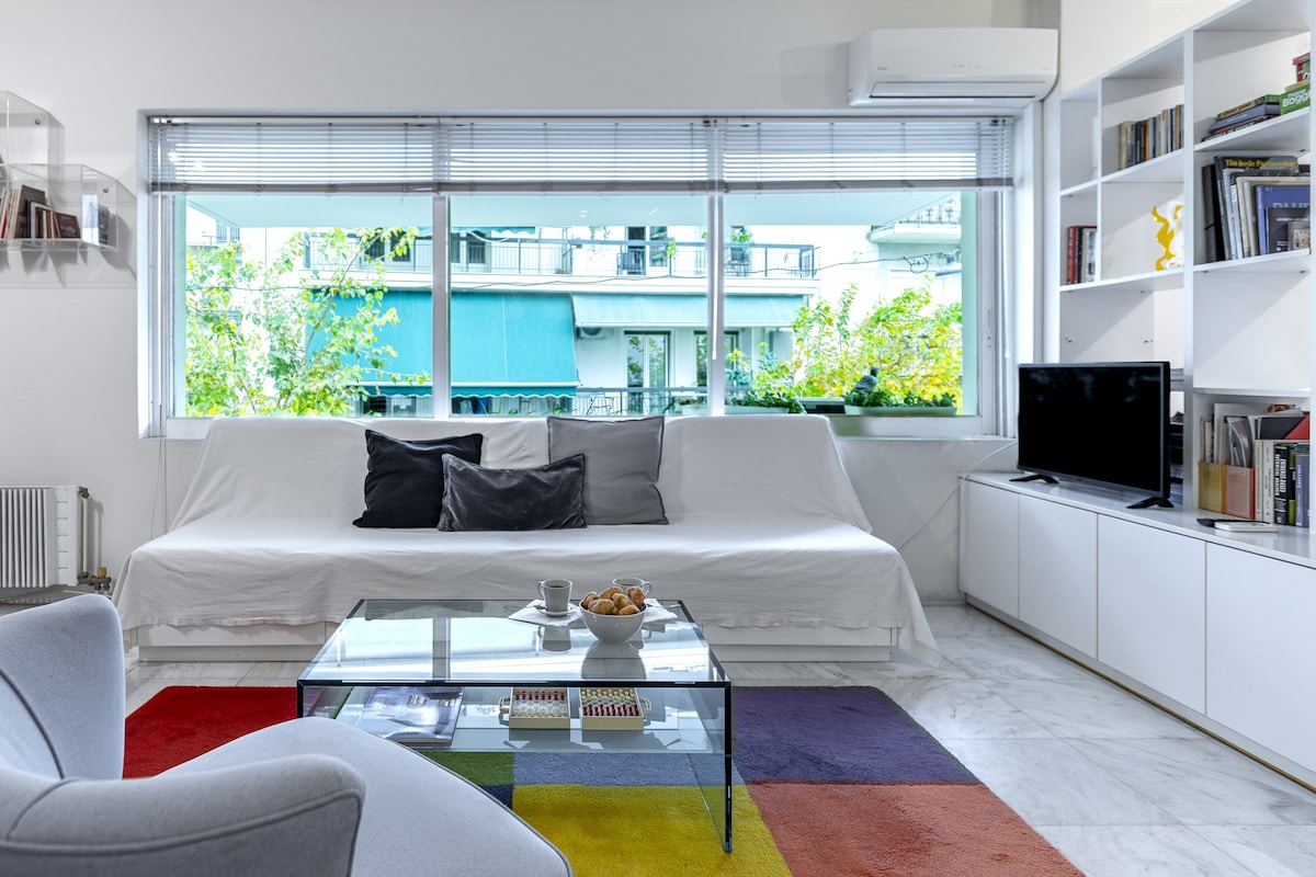This is a truly one-of-a kind apartment, with original interior design elements from the 70s, combined with all the modern comforts! It is spacious, bright, and perfectly located next to the sea, on the coast of Athens, 20 minutes away from the city centre.