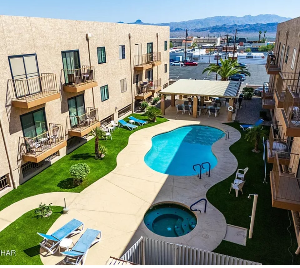 780 sq ft of private indoor space; a place to call home in Havasu. Perfect for a romantic getaway or quiet relaxation! Comfy King bed in the bedroom, a full-sized murphy bed in the living room, kitchen, dining area, flat screen TV, fast WIFI, air conditioning, tiled walk-in shower. Shared outside patio/pool/hot tub and putting green. -Sparkling HEATED Pool and Hot Tub -Mini putting green for fun and laughter. We have clubs and golf balls. -Many Comfortable outdoor seating areas.