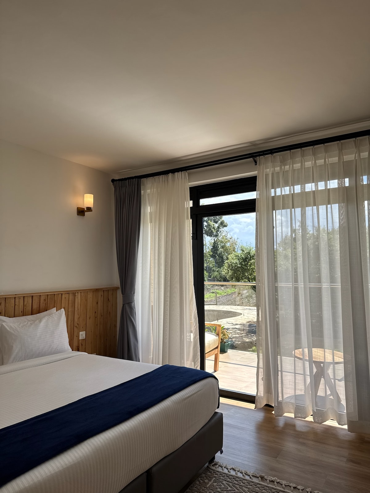 You won’t want to leave this Bohemian Eco-lodge with Stunning Kigali Views! The Penthouse is equipped with 2 bathrooms, both with hanging plants, glass showers, and with wooden sinks. The kitchen outside creates a nice at-home atmosphere and is big enough to prepare whatever you desire, with a view. A jacuzzi is centred right in the middle of the outdoor space that you get to enjoy a glass of wine, a fire, and an amazing view.
