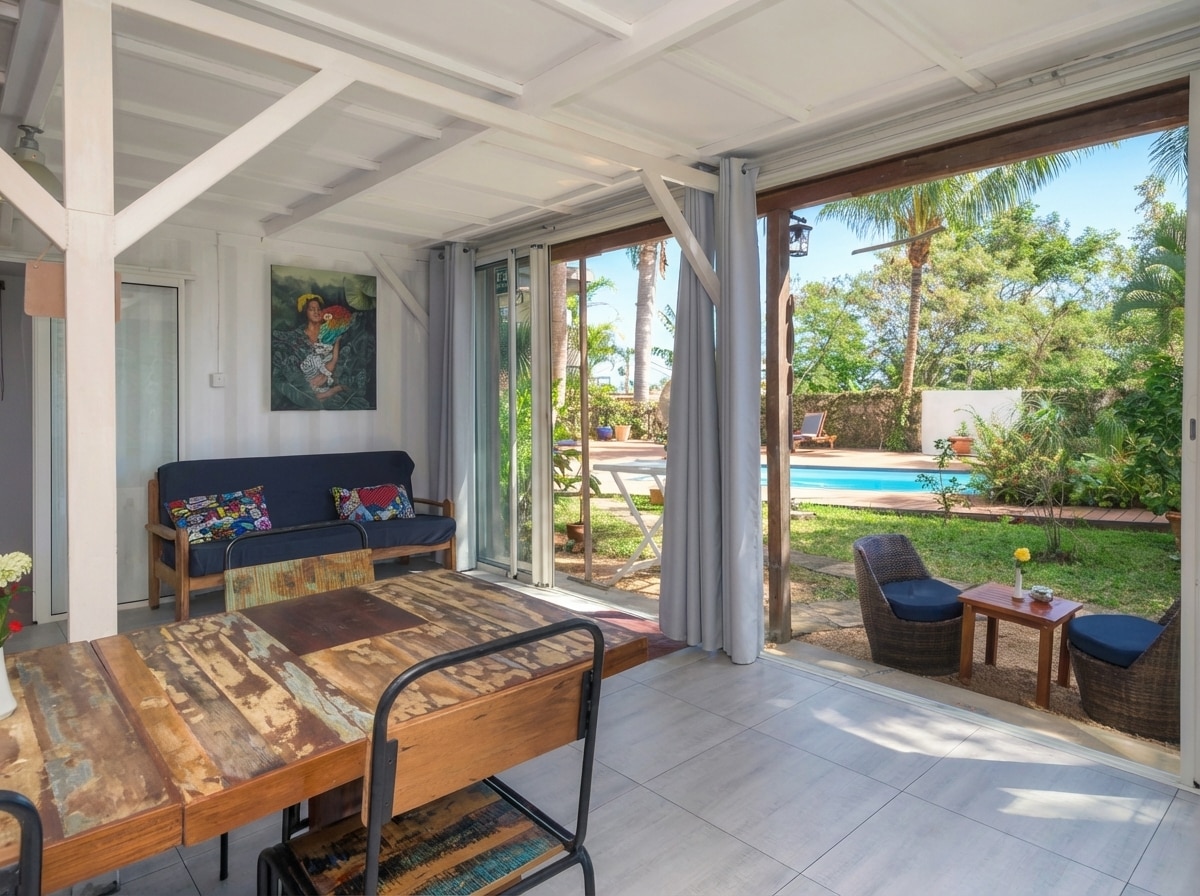 Our belief is that "Paradise" is a way of life. The Rusty Pelican Guest House offers a warm and authentic welcome. This unique apartment built with shipping containers is perfect for those looking for a different and eclectic experience. Relax on a deckchair, enjoy the pool, or go out to explore the island .... many activities are nearby: kitesurf, windsurf, wake, casela, horseback riding, swimming with dolphins ... PLEASE NOTE Chidren below 12 are not allowed in this apartment - no exceptions.