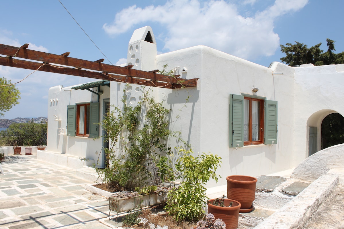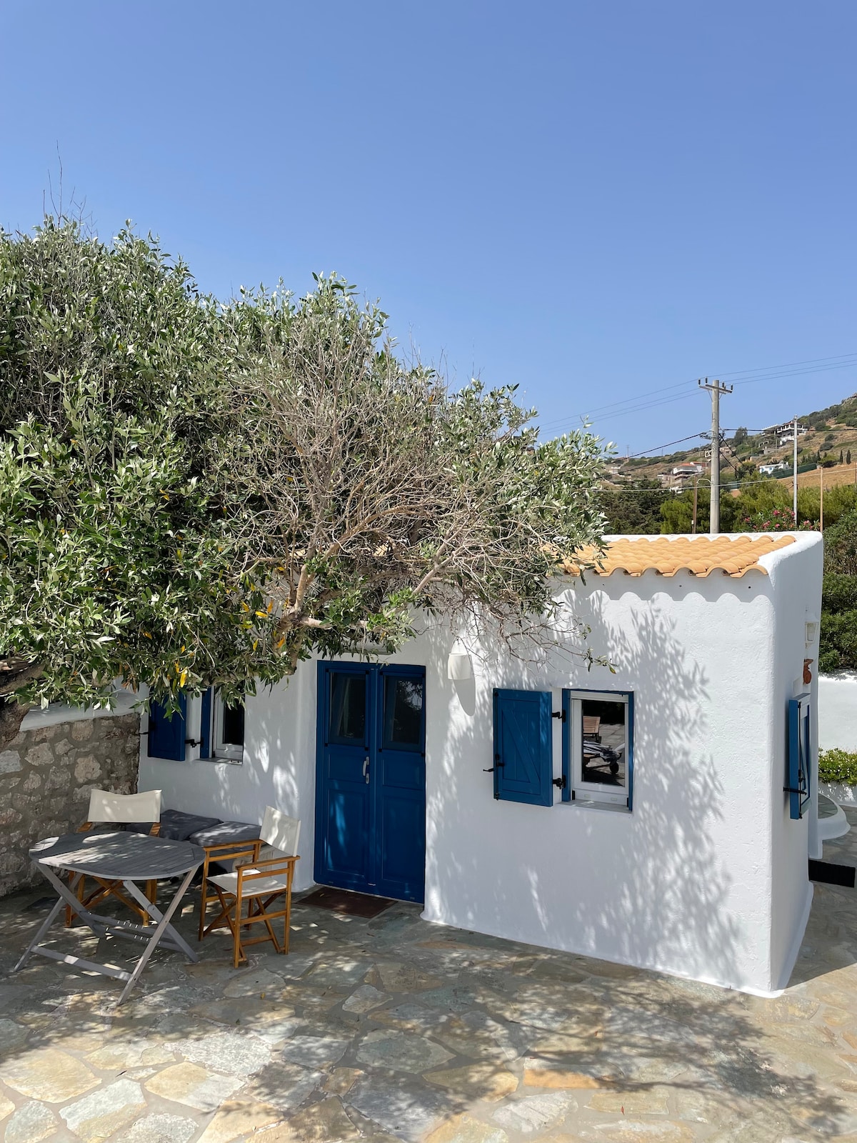 A small lovely house that is built with the same architectural way as the Greek Cyclades islands. Its location has a full view of the Saronic gulf and its beautiful sunsets. It hosts up to four guests. The main room of this beautiful home contain 3 beds (2 single beds and a double one). There is also a kitchen and bathroom, 2 outdoor showers, a dining comfortable table plus a free mini-bar. The wooden pergola and pines complement the built volume providing shading and a natural feeling.