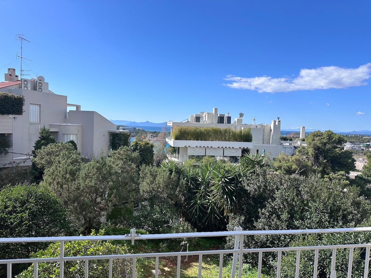 A luxurious apartment with magnificent view situated in the heart of Vouliagmeni the top destination of Attica Riviera . Only 3 mins walking distance to the beach, restaurants, market and coffee shops .So close to the beach and the lively center yet on a quite street among pine trees, offering a spacious balcony with great sea view and colourful sunrises to make you feel relaxed and revived. It is 20 min by taxi from the Airport and 35 min by bus to Athens city center Acropolis museum.