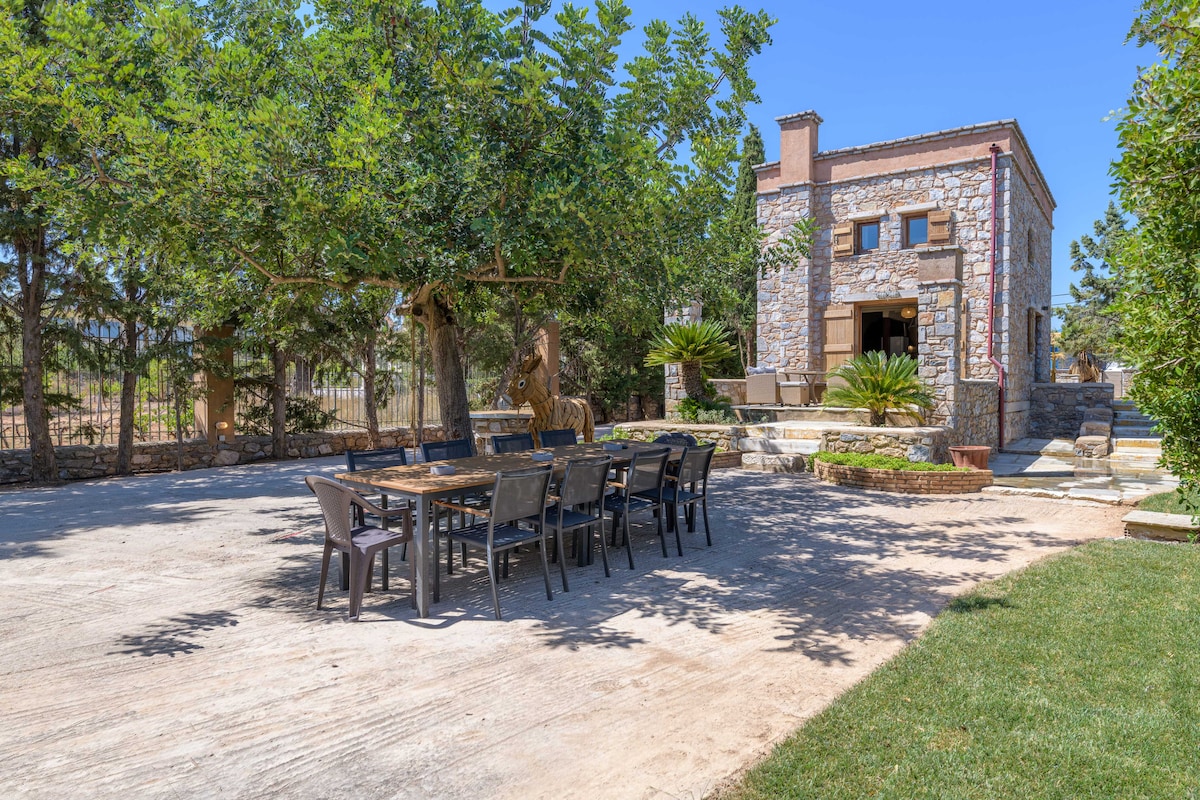 The house with its’ stone-paved surroundings, is situated at the end of the drive and in the middle of the property, far enough from the nearest road to offer privacy and tranquility.