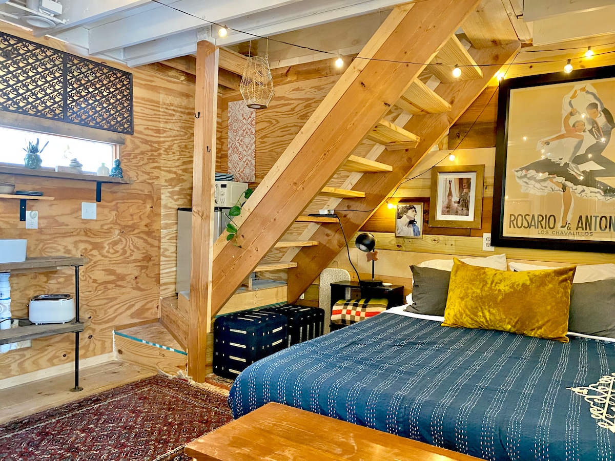 Tucked away in a quiet backyard, this artsy studio is your perfect Austin hideout. Full of creative touches and cozy charm, it’s ideal for solo stays or a duo on the go. Enjoy your morning brew before heading out to explore. Located in a walkable East Side neighborhood, you’re just steps from local bars, cafes, shops, and all the cool Austin vibes. Stylish, simple, and super convenient—welcome to your tiny retreat! -mini fridge -microwave -toaster -hot plate -Keurig (coffee provided)