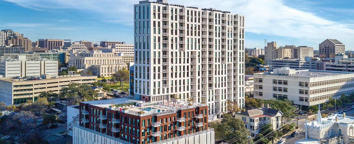 靠近德克萨斯大学奥斯汀分校,带屋顶泳池、酒吧和餐厅。