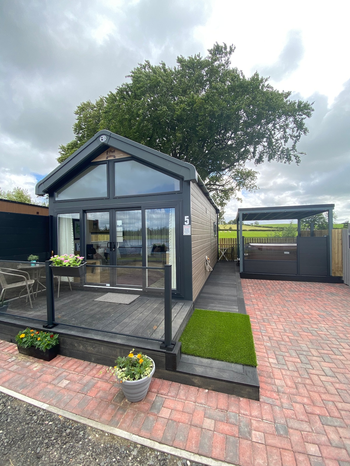 Pod 5-Luxury Lakeside Glamping Pod With Hot Tub. New luxury holiday pod set on a scenic trout fishery.Our self catered pod has everything you need to make your stay as comfortable as possible. The pod comes with its own hottub with stunning views of the fishing ponds. Climb the small ladder stairs and you’re in the upstairs bedroom which has a loft apartment feel. The pod comes with a king size bed and a sofa bed also a kitchenette with hob, oven,fridge, microwave and all the kitchen essentials