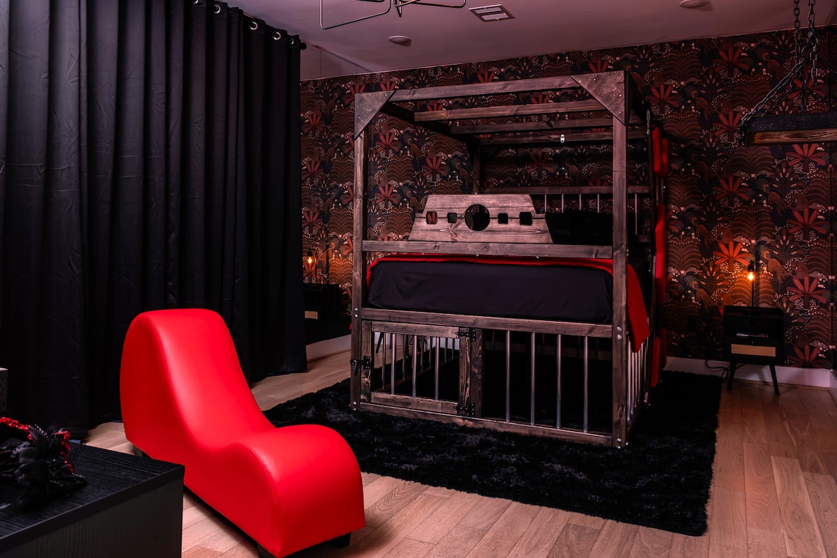 Welcome to the Lightshow. The space transforms into a different space at night. The lights are fully customizable for whatever mood you’re in. Watch a movie in your own theater room with massaging seats. Relax on the patio under the string lights and listen to the waterfall from the pool below. Take a photo in front of the many different areas. Most of the lights are controlled by an app you can download.