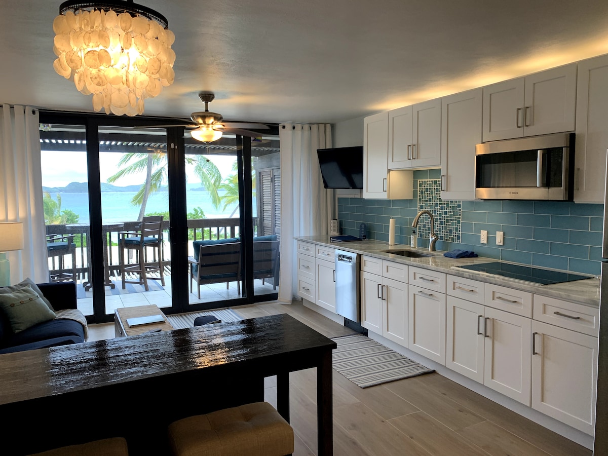 Beautiful Waterfront Condo, in gorgeous St. Thomas, U.S. Virgin Islands, overlooking Red Hook and uninhabited islands. All 32 condos were recently renovated as of 2020. Renovations are now complete on all units, and includes new exterior, new windows, doors, glass sliding doors all to building code. Inside the condo recent updates include a new kitchen, new stove, new ceiling fans, new bathroom vanity, new furniture. Air Conditioning a split level 24k unit works great and pumps cold A/C.