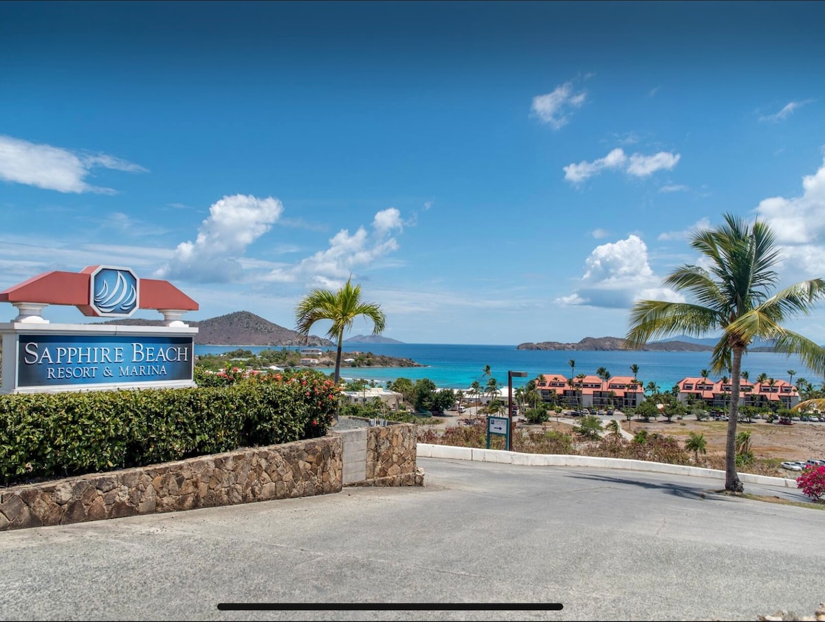 Located at Sapphire Village-Amazing balcony and views of Sapphire Beach and its glimmering turquoise waters. Short walk to the beach and beach bar! 1 King bed, and one queen sleeper sofa. Property has hotel amenities including 2 pools, great snorkeling, 3 restaurants, beach bar, coffee shop & deli! Secure, safe location. Taxis are readily available nearby for rides to grocery stores, Red Hook for dinner, St. John Ferry, local beaches. 25 min from airport!