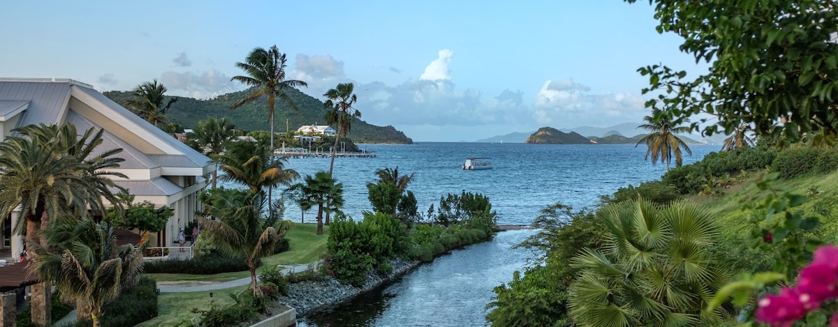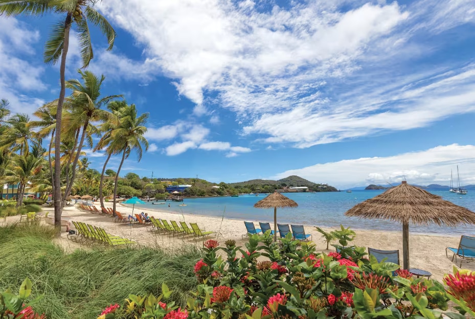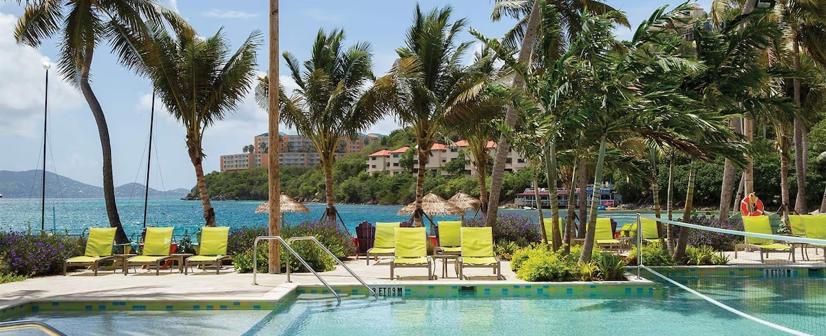 Nestled among swaying palm trees, this idyllic resort is the epitome of a tropical paradise. Lounge by the shore, barefoot and carefree, with a refreshing cocktail in hand. Gaze out at the endless blue sky, the shimmering, crystal-clear waters, and the stunning silhouette of St. John island on the horizon. Whether you're unwinding in the sun or soaking in the scenery, this serene getaway offers a perfect escape into island bliss and tranquility.