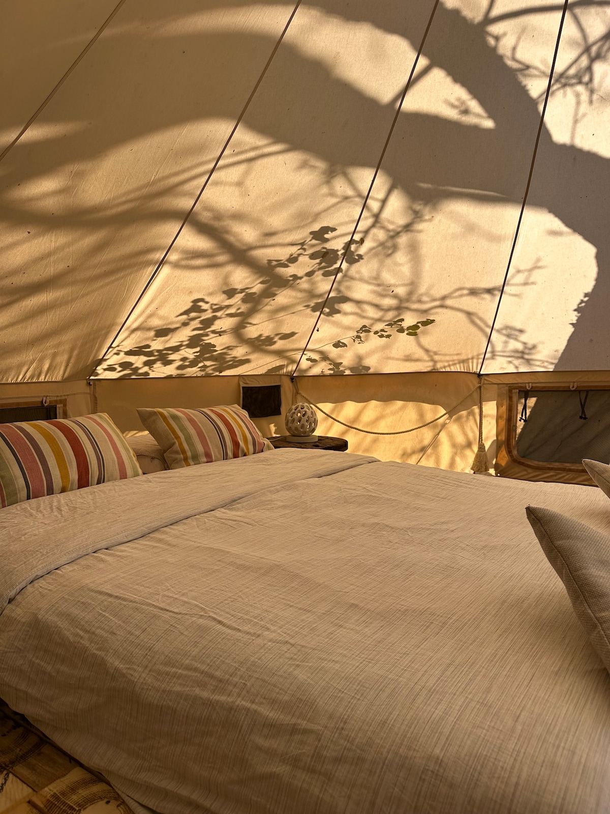 Knusse glamping tent voor 2–3 personen De tent is voorzien van een 2-persoonsbed. Kom je met z’n drieën? Neem dan zelf een extra matje of bedje mee , idyllisch gelegen tussen de velden en het groen. Geniet van rust en romantiek : privé sanitair en een hout gestookte hot tub onder de sterren. Perfect voor een ontspannen uitje in de natuur. Boek nu jouw romantische escape! Alles is VOLLEDIG privé.