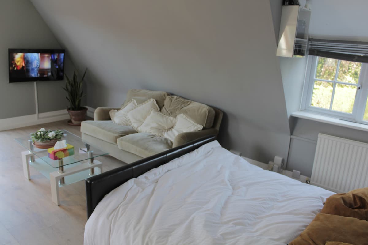 Our beautiful converted Granary is just across the courtyard from our farm house and is totally self contained. It is a huge open plan room with exposed beams, wooden floor, rugs, an extremely comfortable sofa bed, a mezzanine with two single mattresses suitable for agile extra guests, a kitchenette and a lovely shower room. There is an enormous bookcase which guests are welcome to borrow from during their stay and a equally large flat screen TV with Sky, Netflix etc