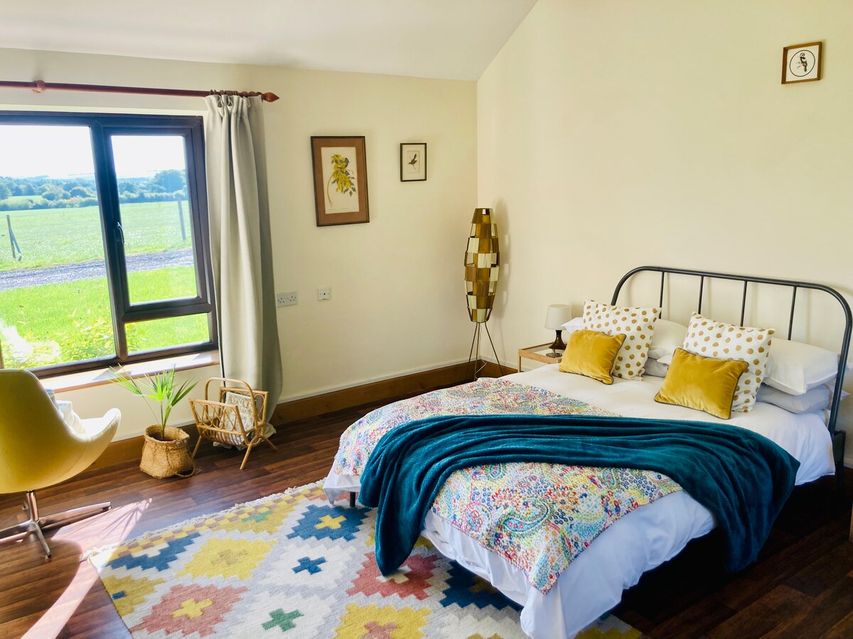 Our beautiful converted Granary is just across the courtyard from our farm house and is totally self contained. It is a huge open plan room with exposed beams, wooden floor, rugs, an extremely comfortable sofa bed, a mezzanine with two single mattresses suitable for agile extra guests, a kitchenette and a lovely shower room. There is an enormous bookcase which guests are welcome to borrow from during their stay and a equally large flat screen TV with Sky, Netflix etc