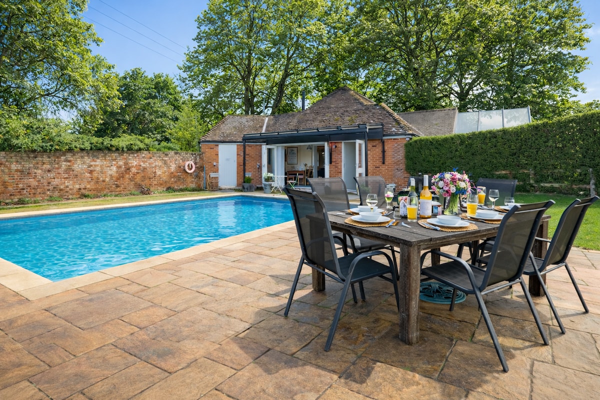 The Barn at Whitmoor Farm is set in the peaceful Surrey countryside and accommodates up to 8 guests, making it ideal for families. It offers two bedrooms — the first with a king bed and bunk beds, and the second with a king bed — plus two single beds in the living area. Enjoy Sky TV, Wi-Fi, and a private indoor grill area. Guests also have shared access to a tennis court, trampoline, and outdoor swimming pool (heated May–September; open unheated until mid-October).